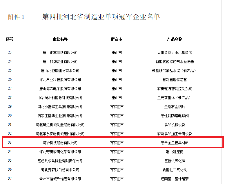 近日,河北省工業和信息化廳發布《關于公布第四批河北省制造業單項冠軍企業名單的通知 冀制強省辦〔2022〕25號》。經企業申報、各市工信部門推薦、專家評審、現場抽查、公示,確定了河北省第四批制造業單項冠軍企業(產品)名單,通過公示期,河冶科技股份有限公司獲得河北省單項冠軍企業認定。